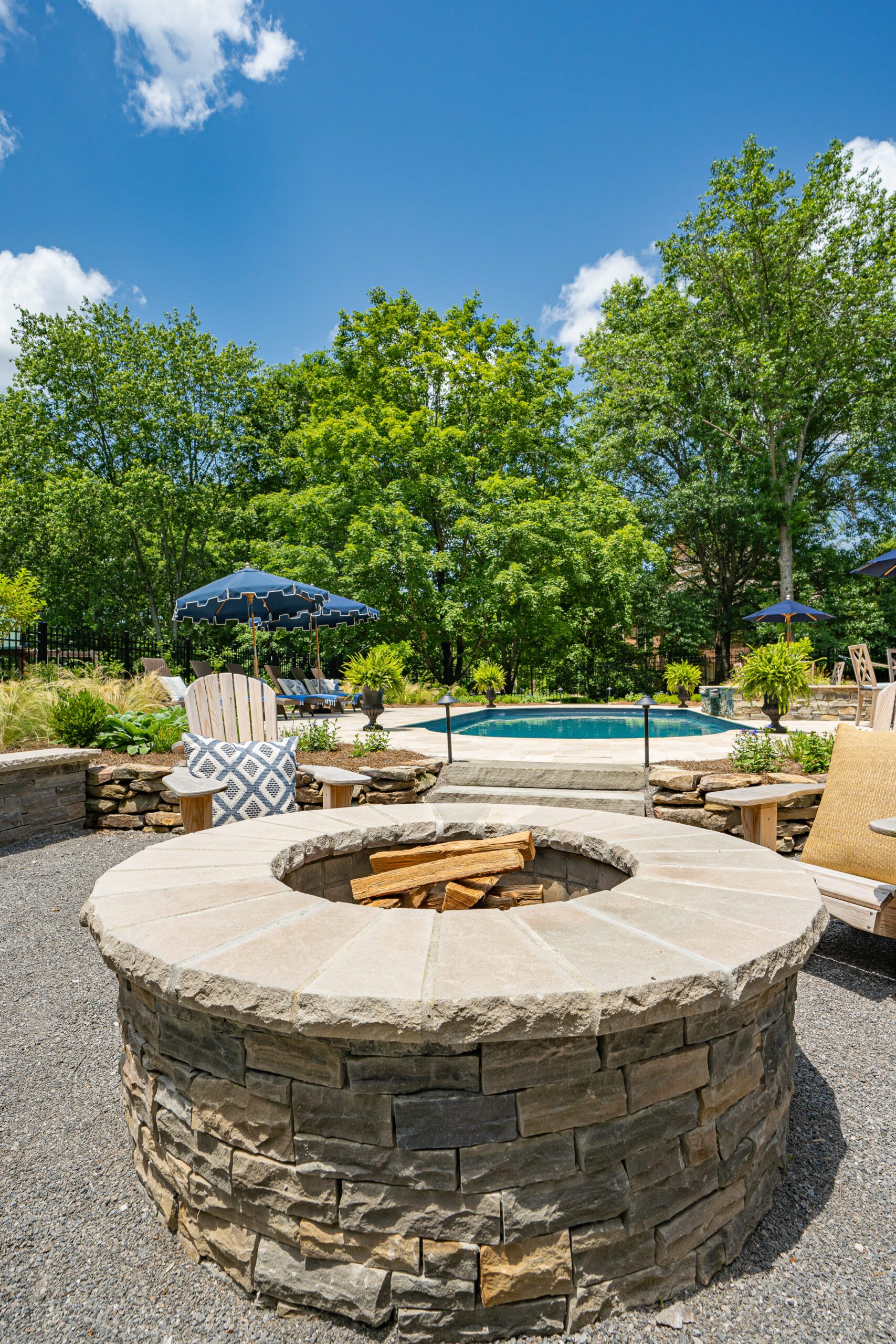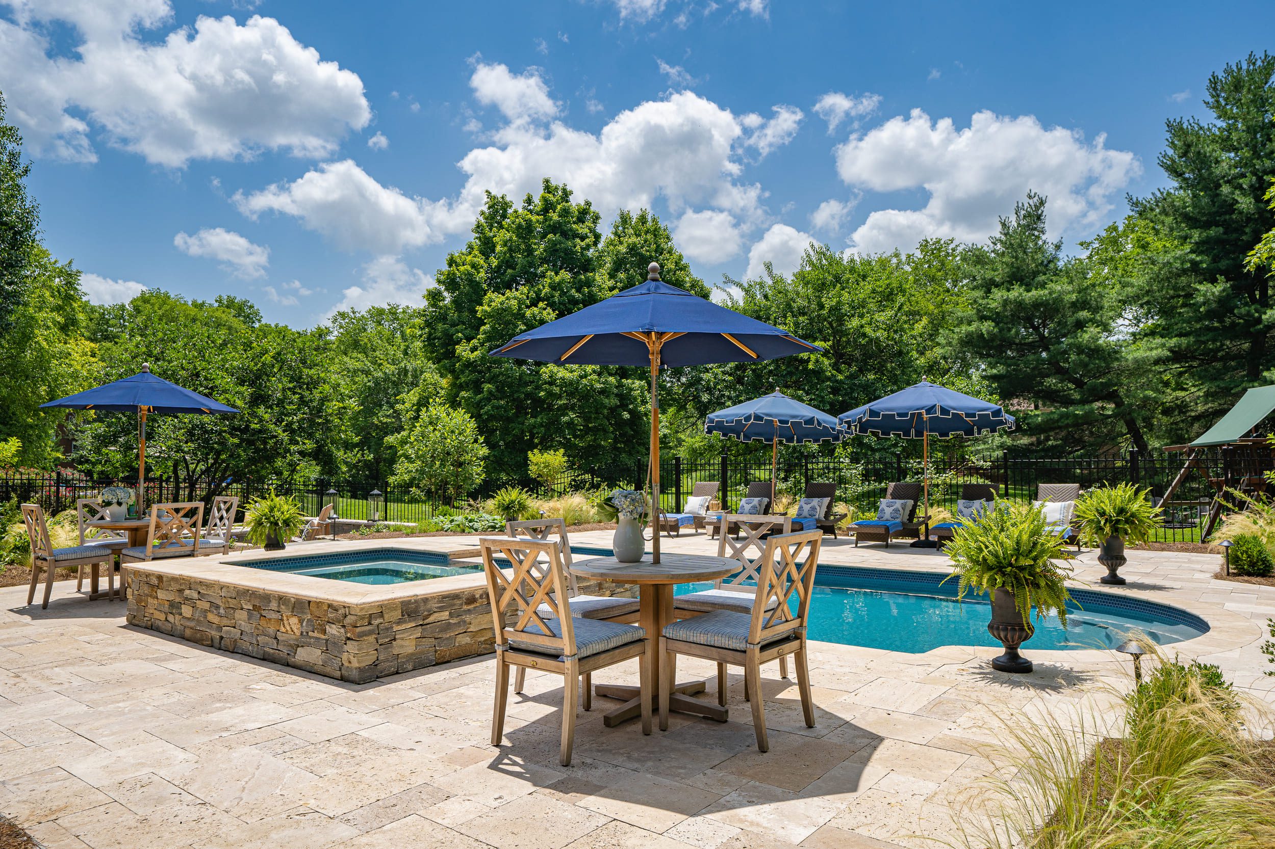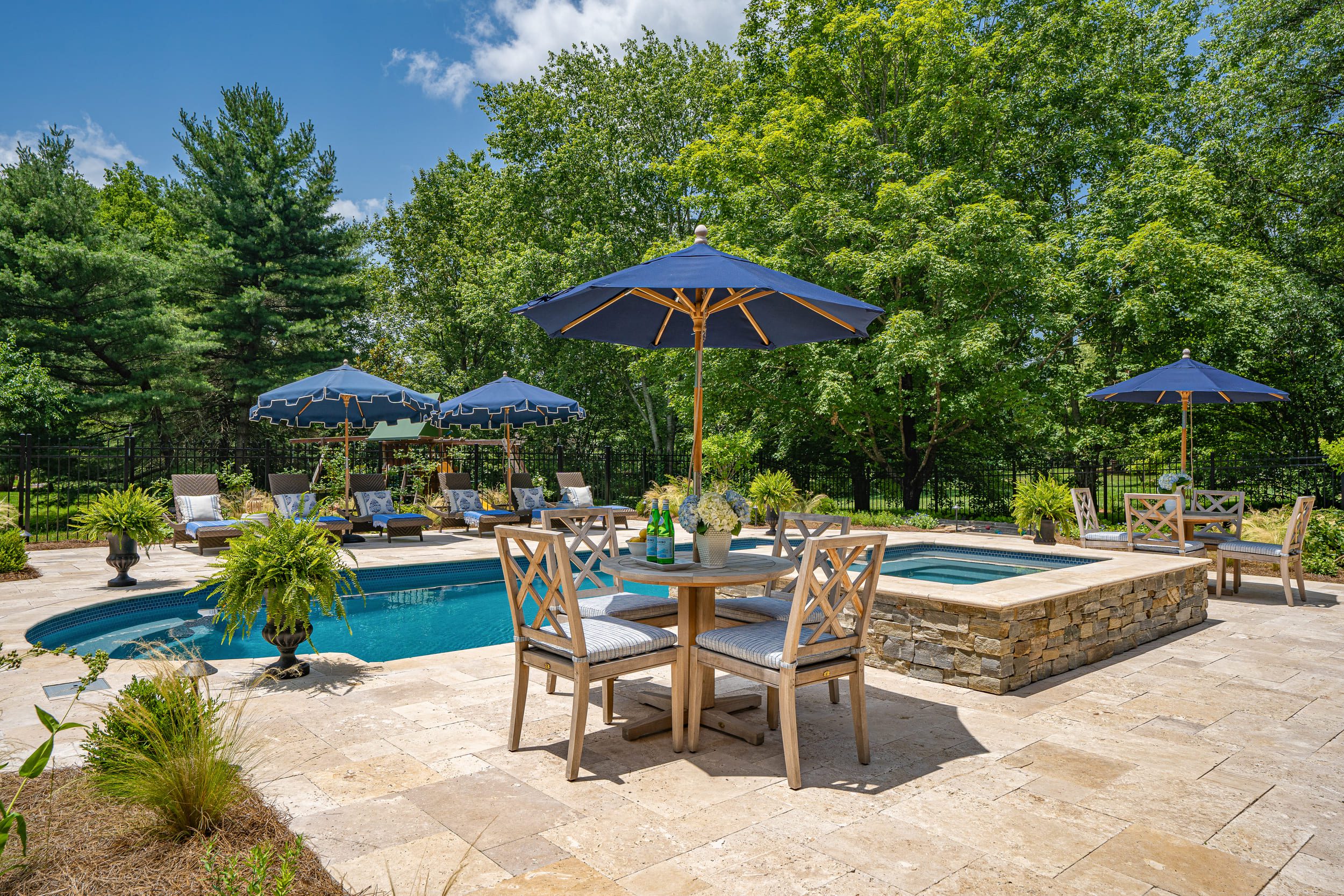Dry stack garden walls and native landscaping weave through this design blending nature with the hardscape elements. At the focal point is a fiberglass pool complete with fountains and a spa with waterfall. The pool is bookended by a bocce or corn hole court on one side, with ample shade during warm summer days. On the other side is a seating area with a natural stone fire pit. This is truly a space the whole family can enjoy during all four seasons!