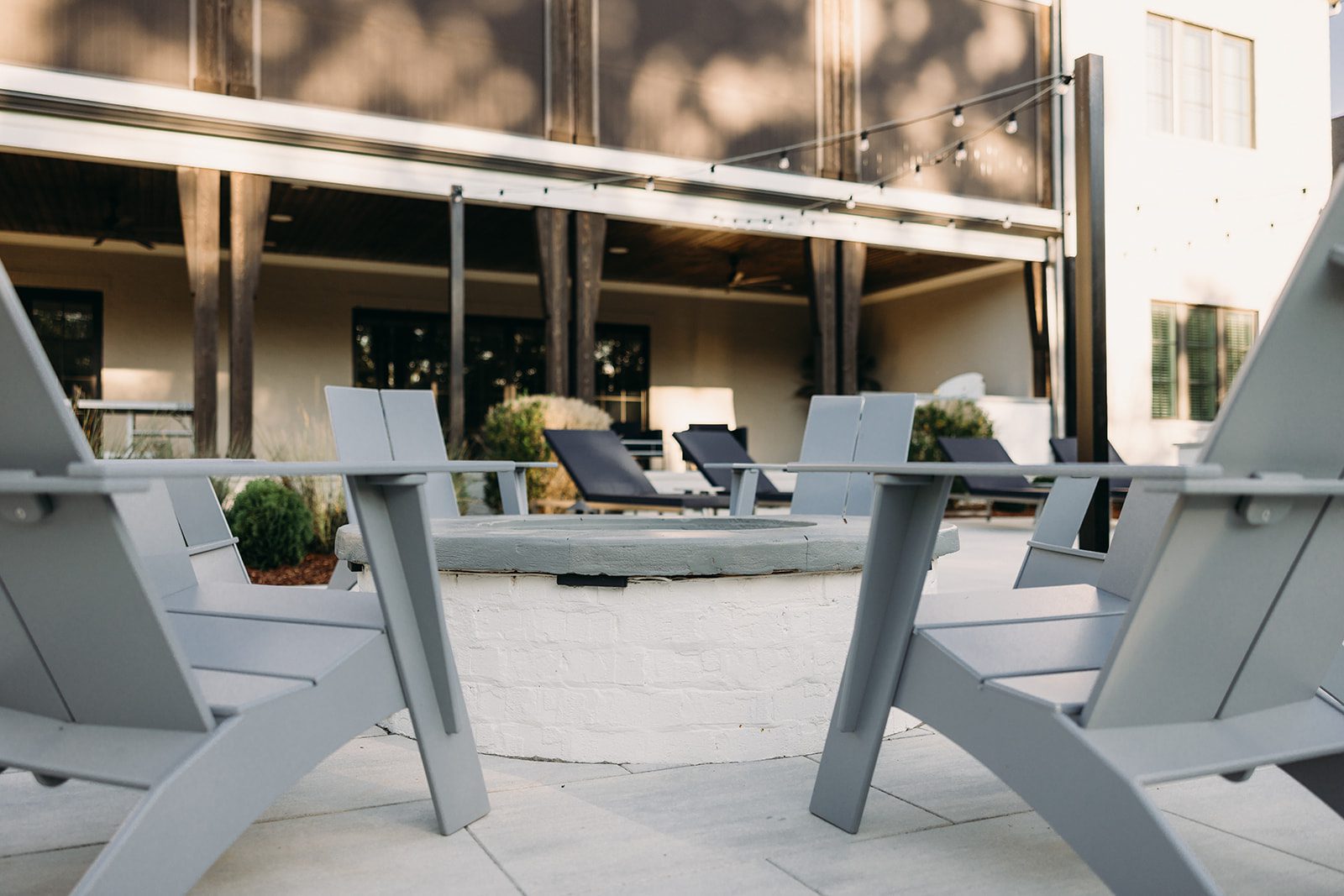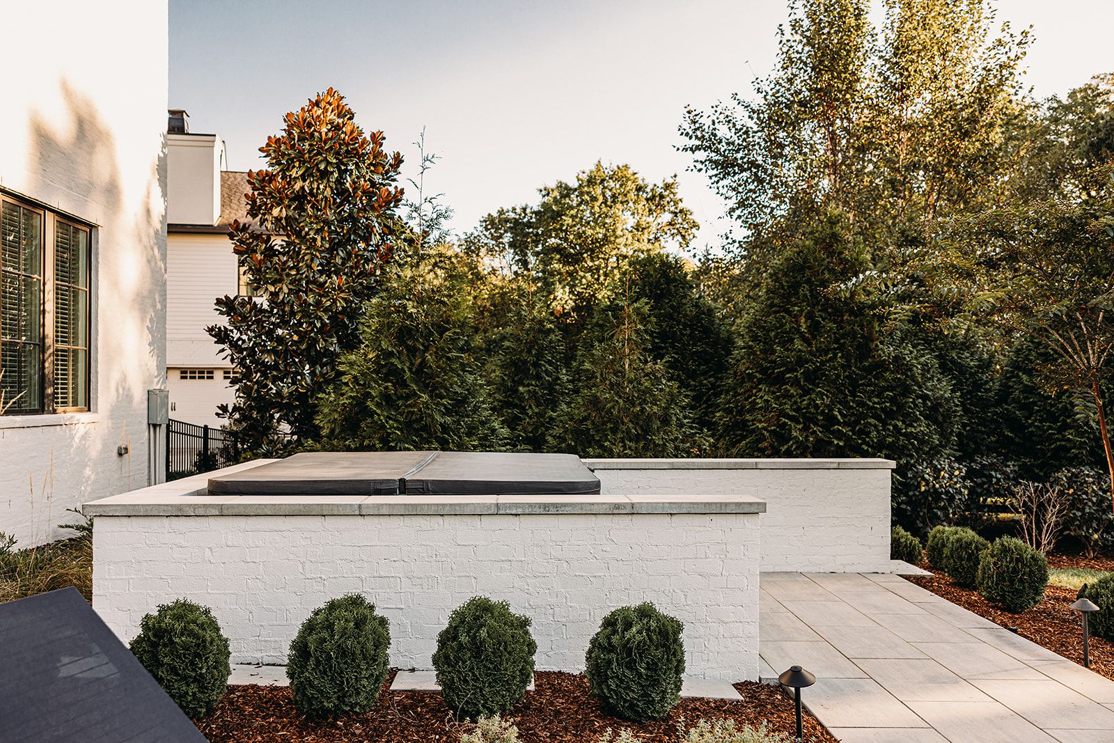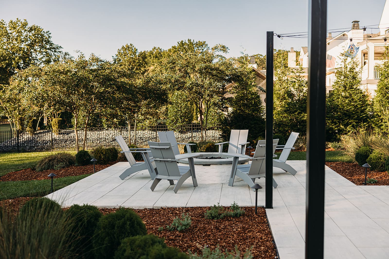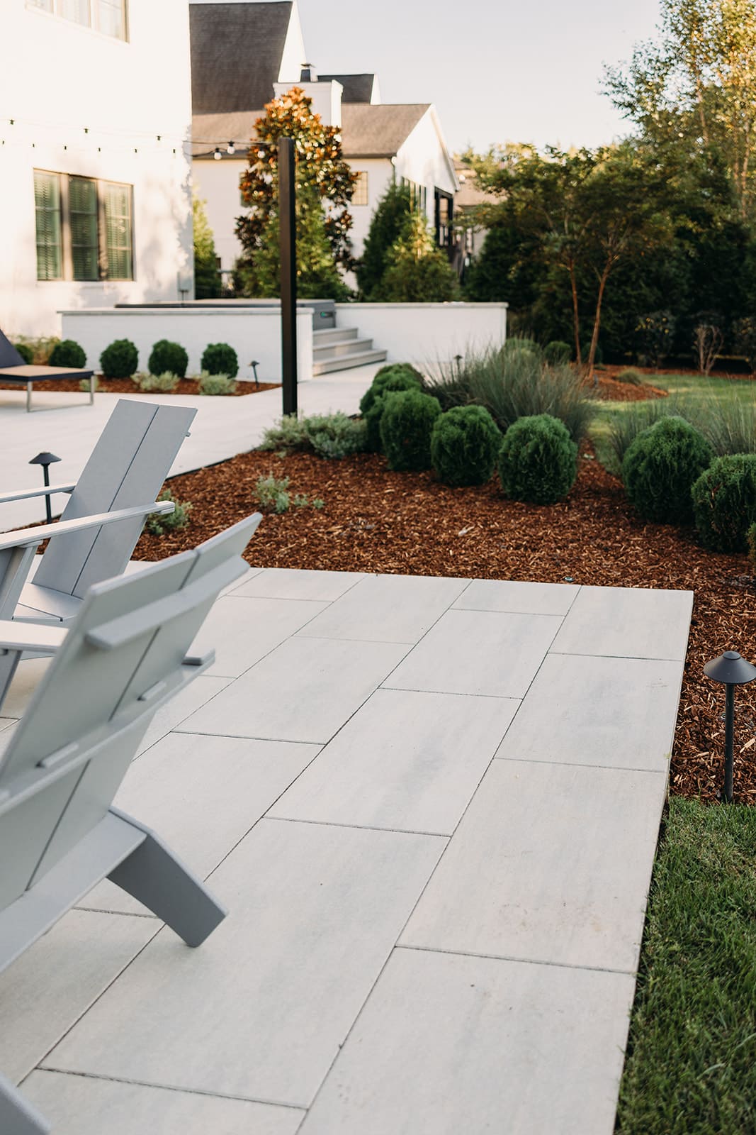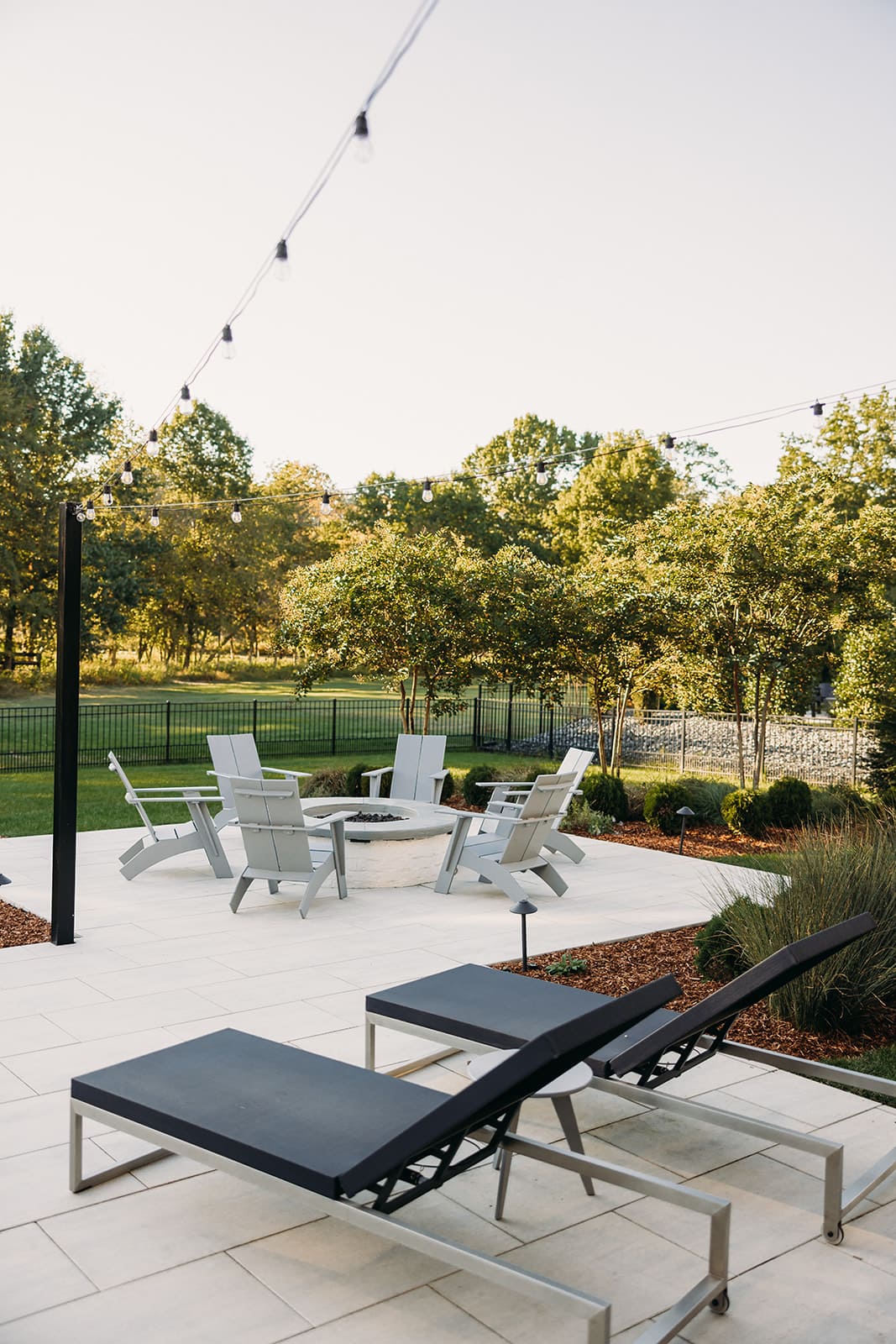 Stepping out the back door, you are greeted by a chef worthy outdoor kitchen, complete with grill, ice maker, refrigerator and ample counter space. Brick with mortar rub is used throughout the design to act as an extension of the clients’ home. Techo-bloc Para pavers in a greyed nickel connect the expansive back porch to the rest of this entertainer’s dream with a fire pit and luxurious spa with privacy wall. The thoughtful landscaping provides a natural privacy screen. This space is designed with landscape lighting, including cafe lights that add a nice warm ambience after the remarkable sunsets visible from every seating area.